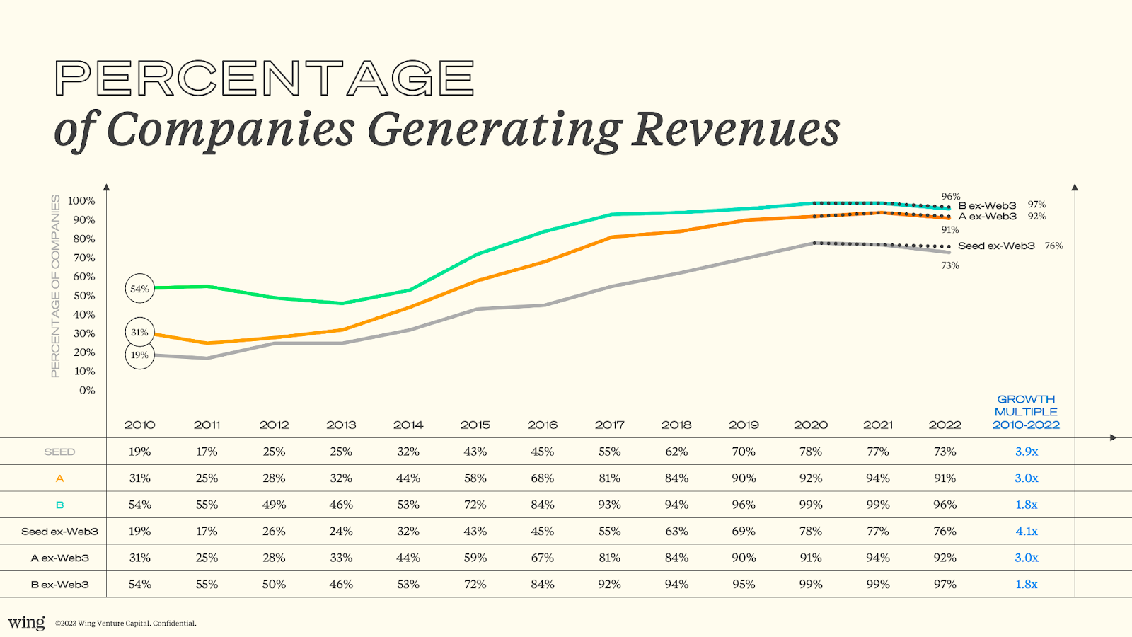 In 2010, 19% of Seed-stage companies were generating revenue. In 2022, it was 73%. And it’s the same story for A (31% to 91%) and B (54% to 96%).